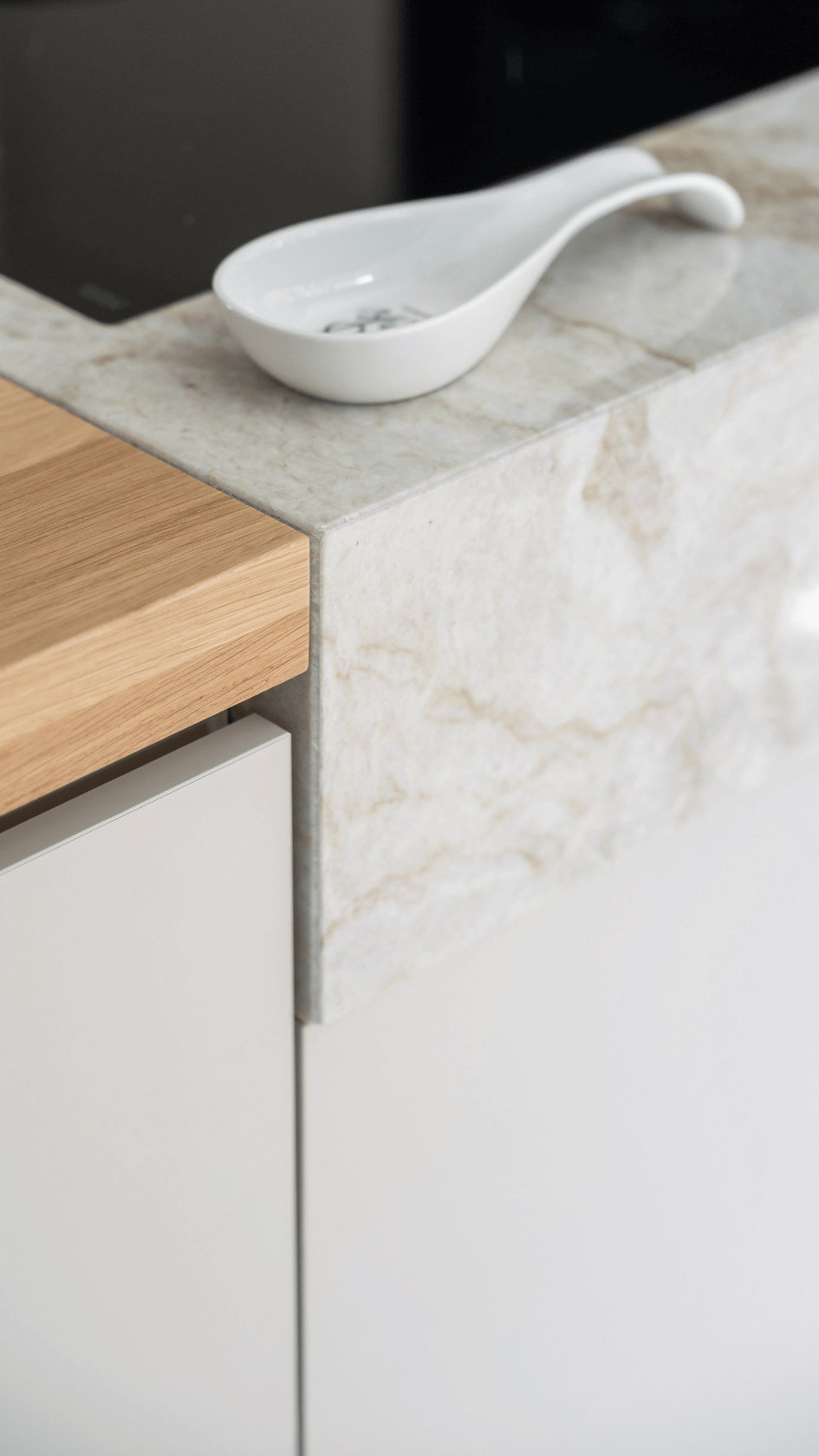 Het keukenblad is uitgevoerd in natuursteen genaamd Taj Mahal, in het kookeiland is de Bora met afzuiging in een royaal opgedikt blok Taj Mahal geplaatst met daaronder de lades voor het keukengerei, de tafel is uitgevoerd in eiken en voorzien van een rank onderstel.