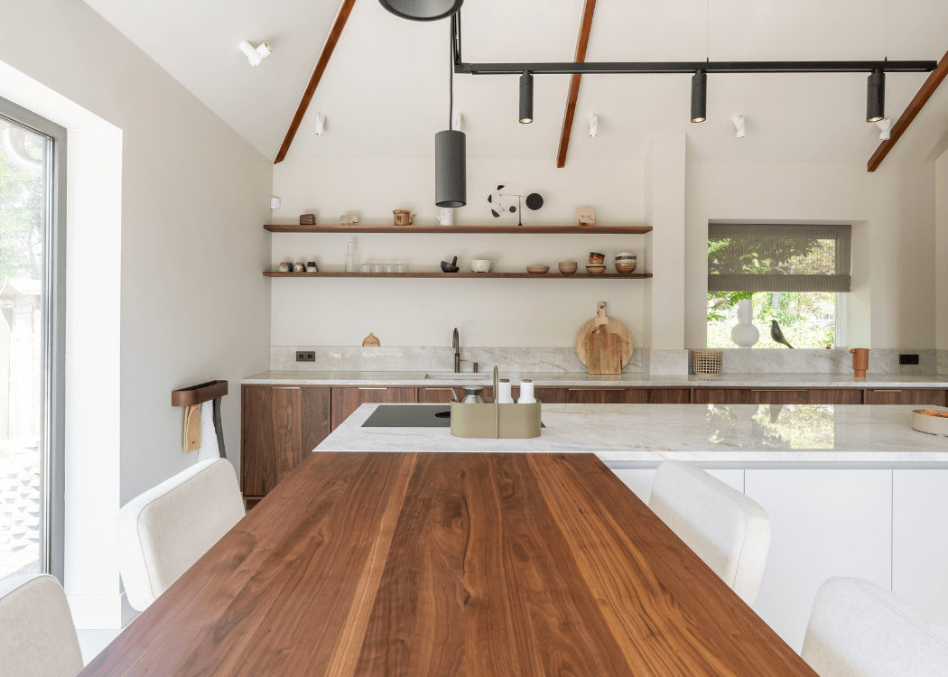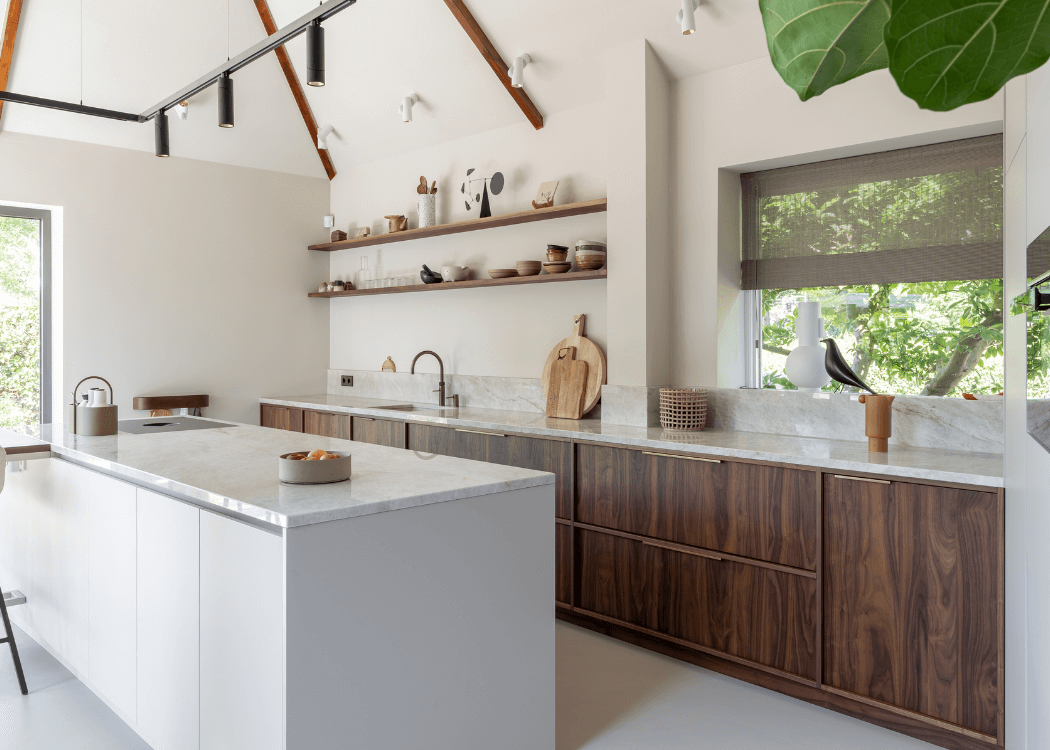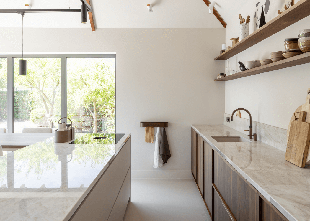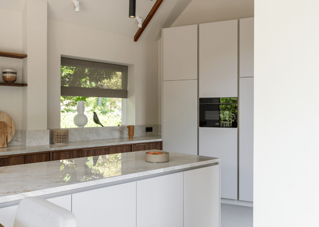 Door gebruik te maken van natuurtinten in combinatie met een Taj Mahal keukenblad en walnoten fronten is er een prettige serene ruimte ontstaan. Mooie details als messing grepen, en lampen van Modular geven de keuken een subtiele uitstraling. De Bora kookplaat met afzuiging mag in deze sfeervolle maar tevens praktische keuken niet ontbreken.